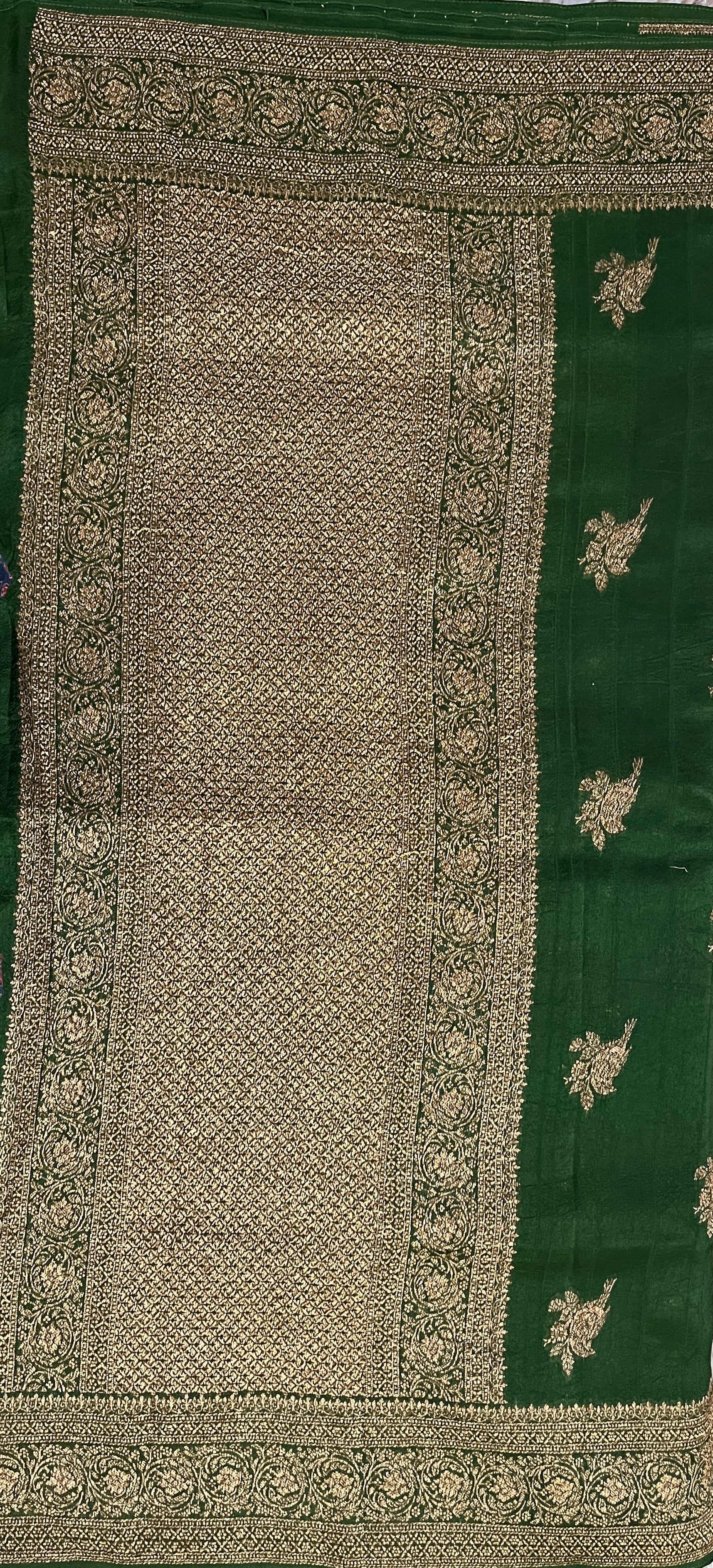 · Color: Deep emerald green with rich golden zari accents