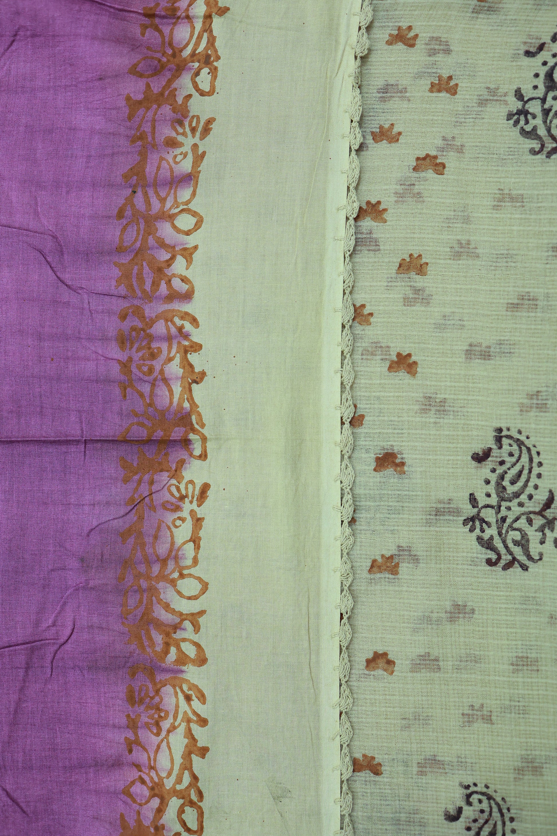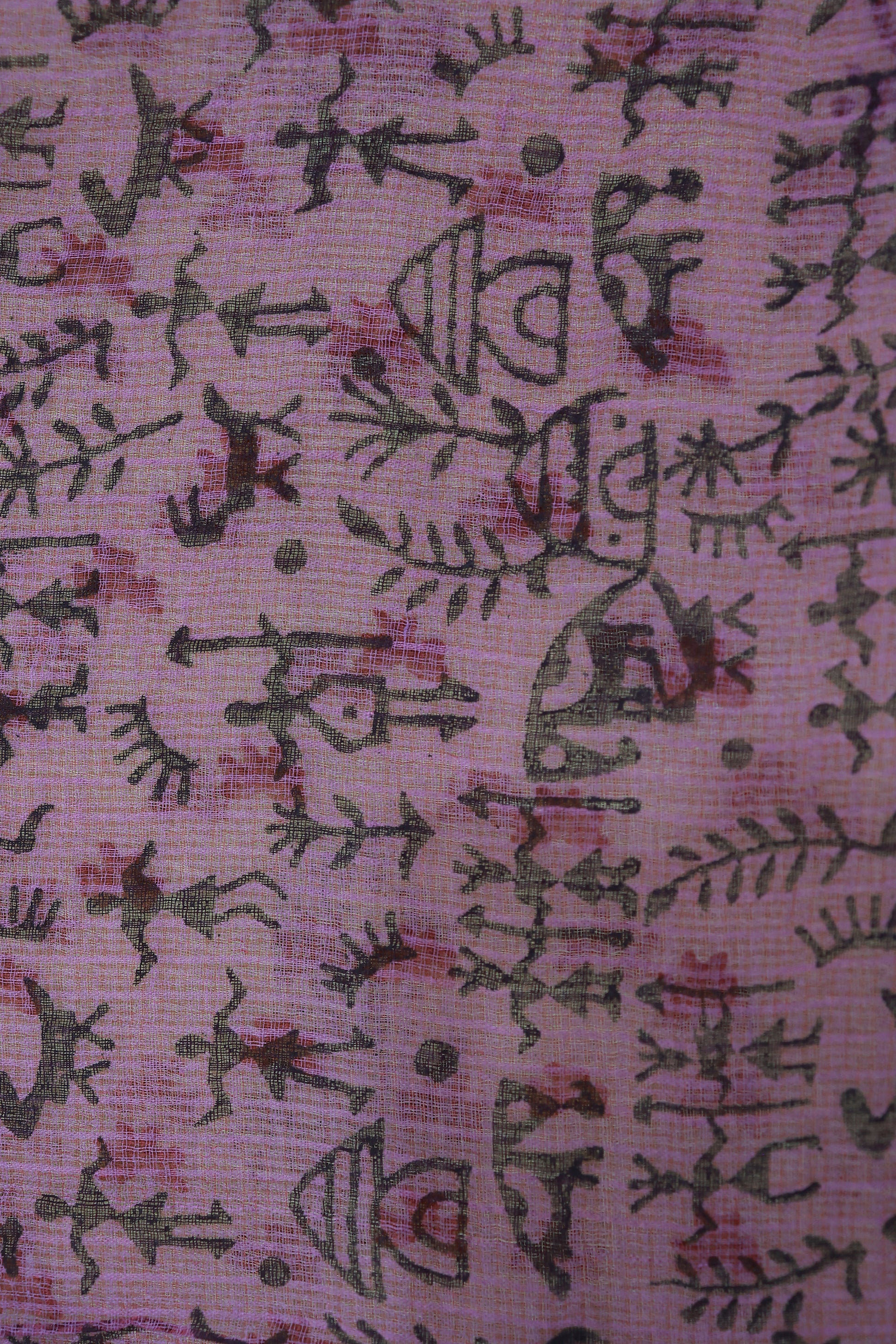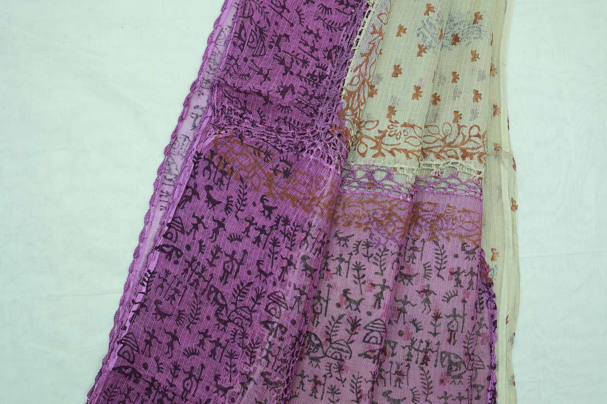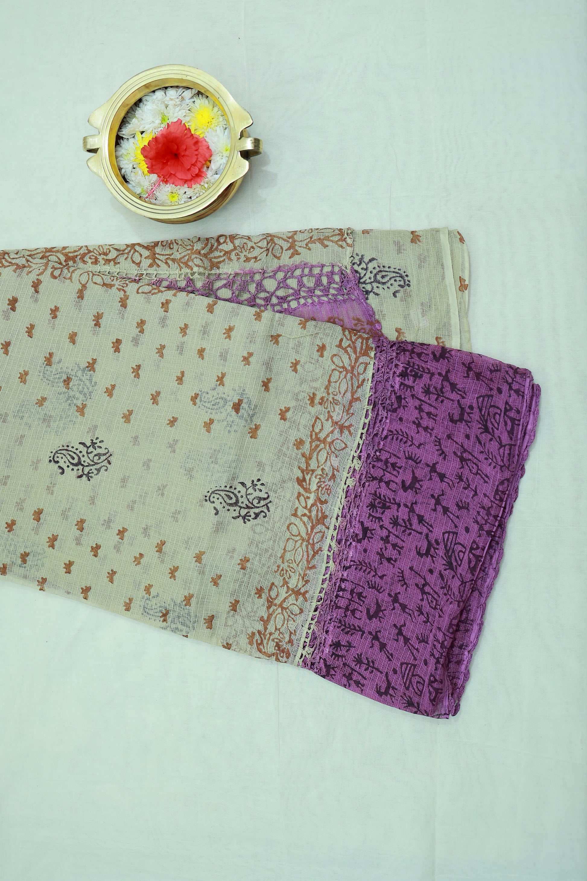 The saree features a beige cotton body with subtle checkered texture and is adorned with tiny block-printed motifs in rust, black, and grey tones. The border is highlighted with traditional floral vine prints in earthy rust color. The standout element is the purple pallu, which showcases Warli tribal art motifs scenes from village life including huts, trees, animals, and human figures rendered in black against the purple base. A delicate crochet-style lace edging completes the vintage handcrafted look.