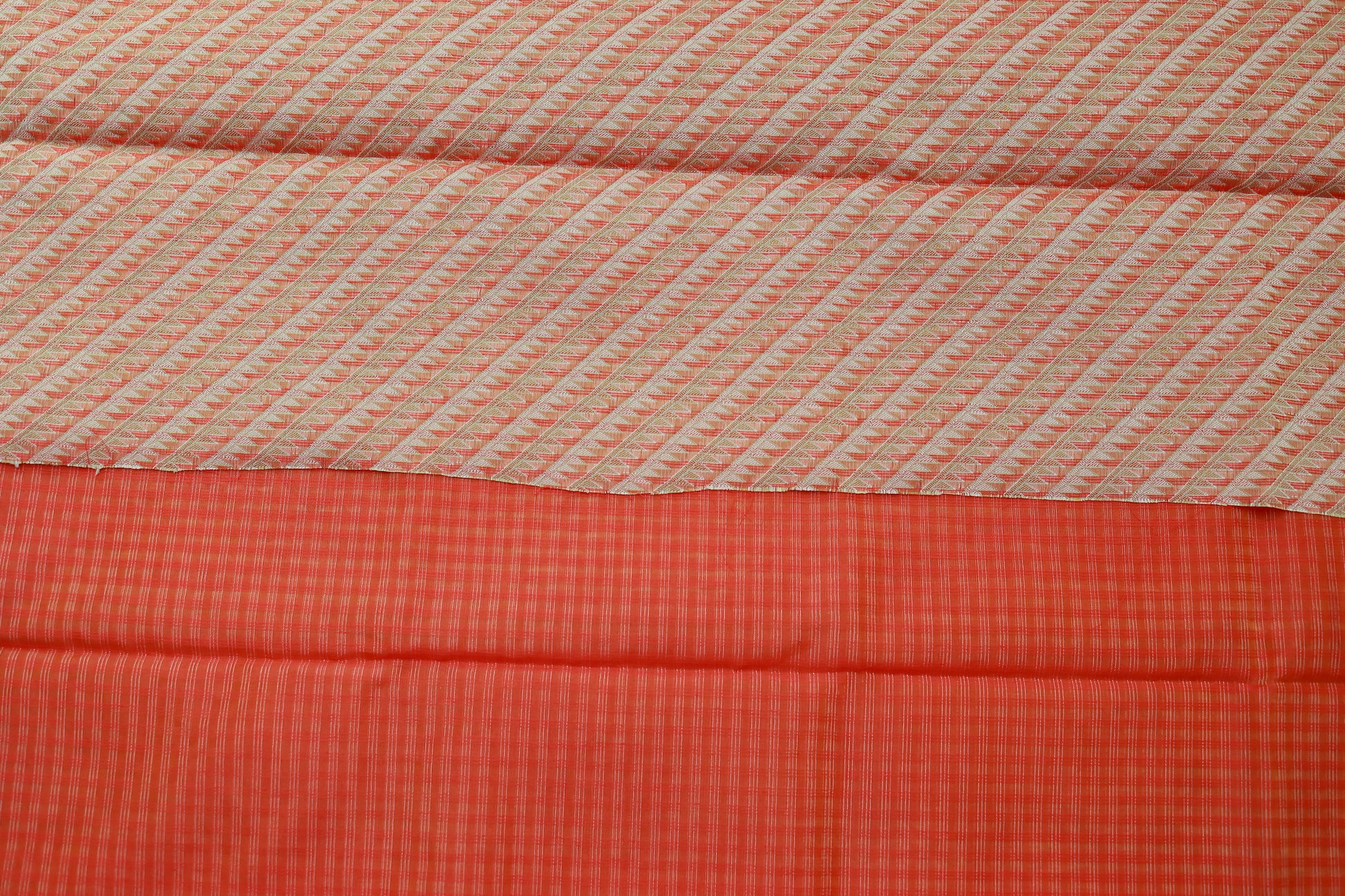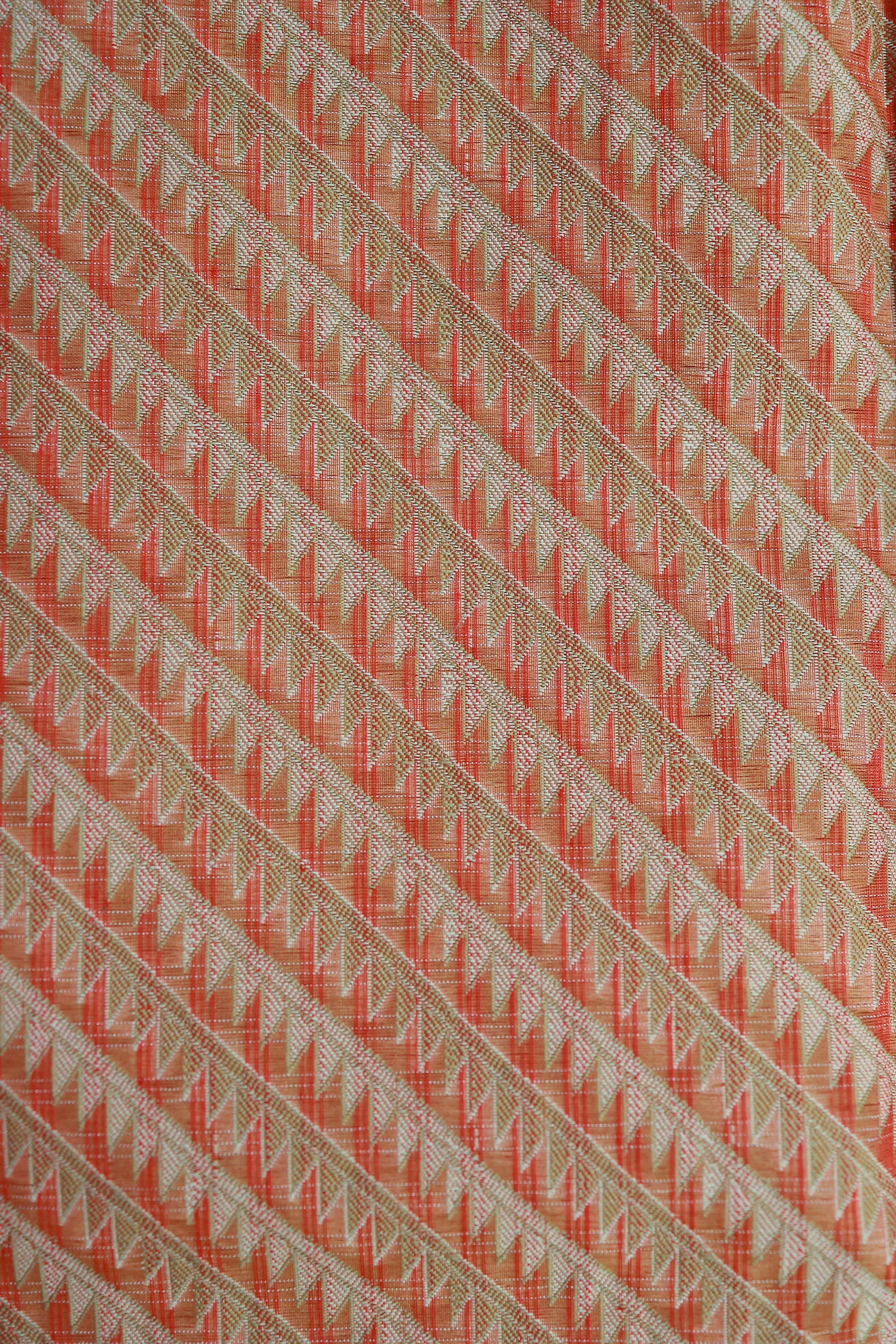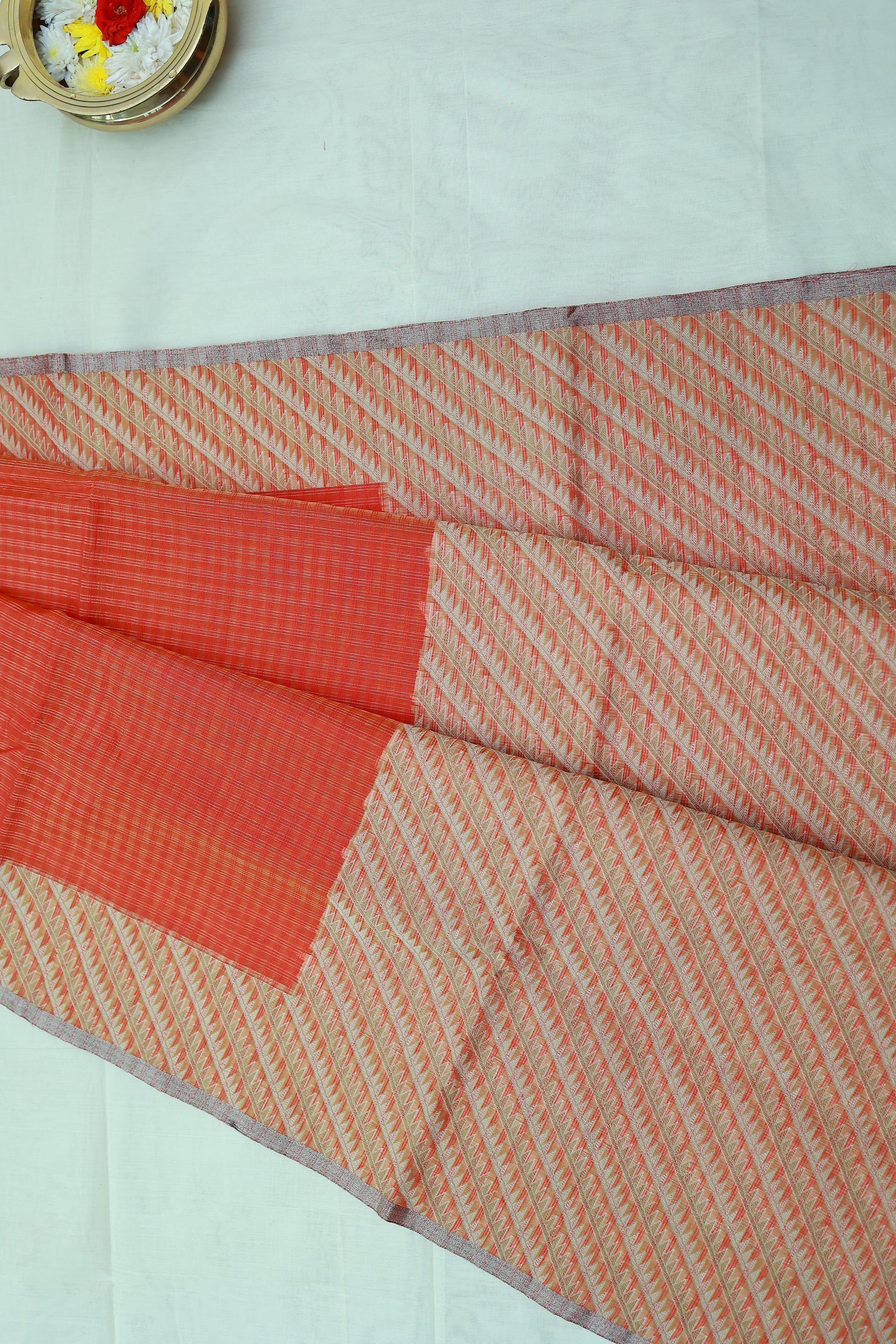 The saree features a beige base interwoven with diagonal leaf or arrow like motifs in rust and coral red shades, creating a consistent and rhythmic pattern across the body. The pallu is contrasted in deep rust red, enhanced with fine vertical stripes, lending it a modern finish while maintaining a handloom charm. The edges are subtly defined with a muted greyish-brown selvedge, adding structure without overpowering the design.