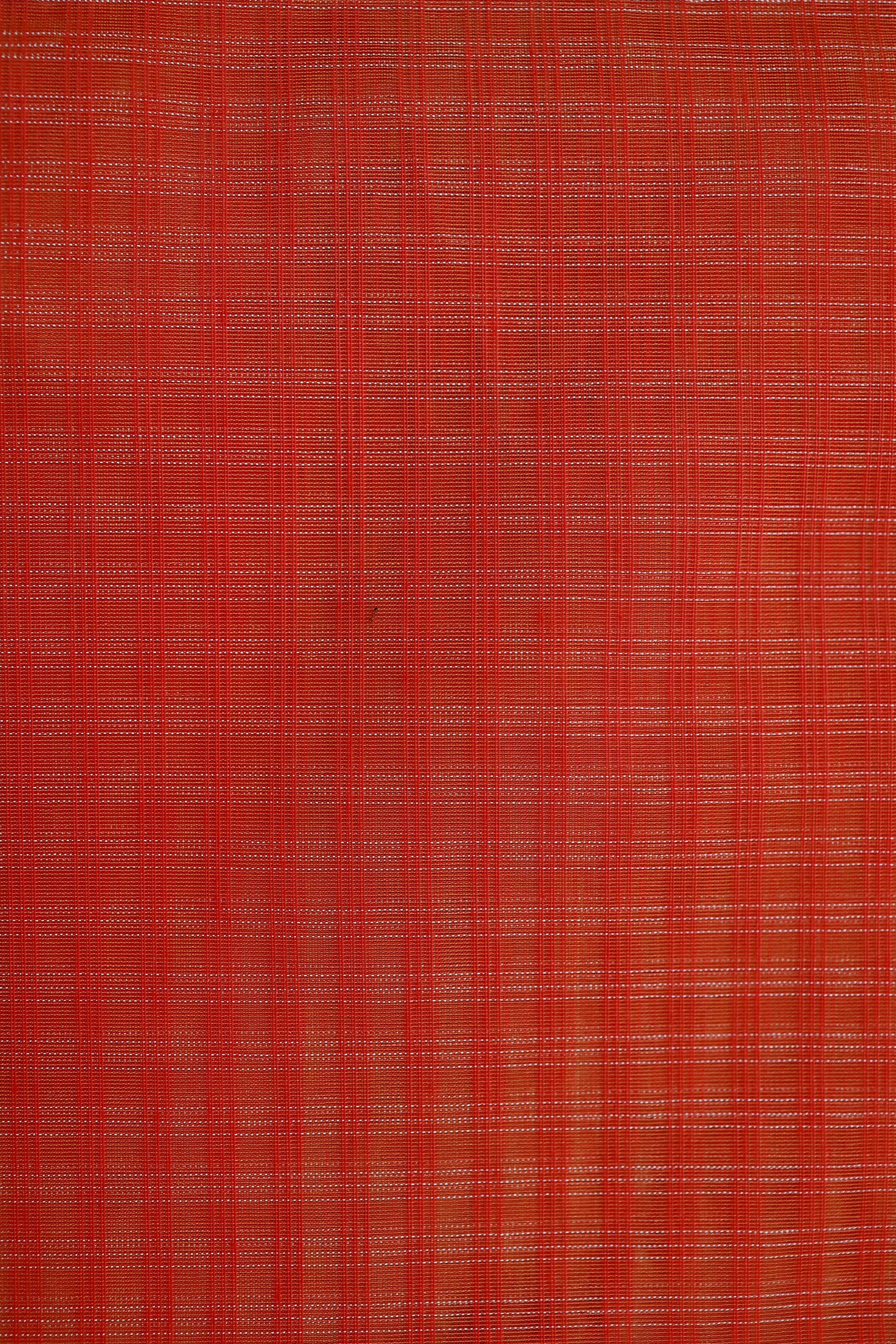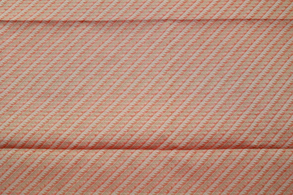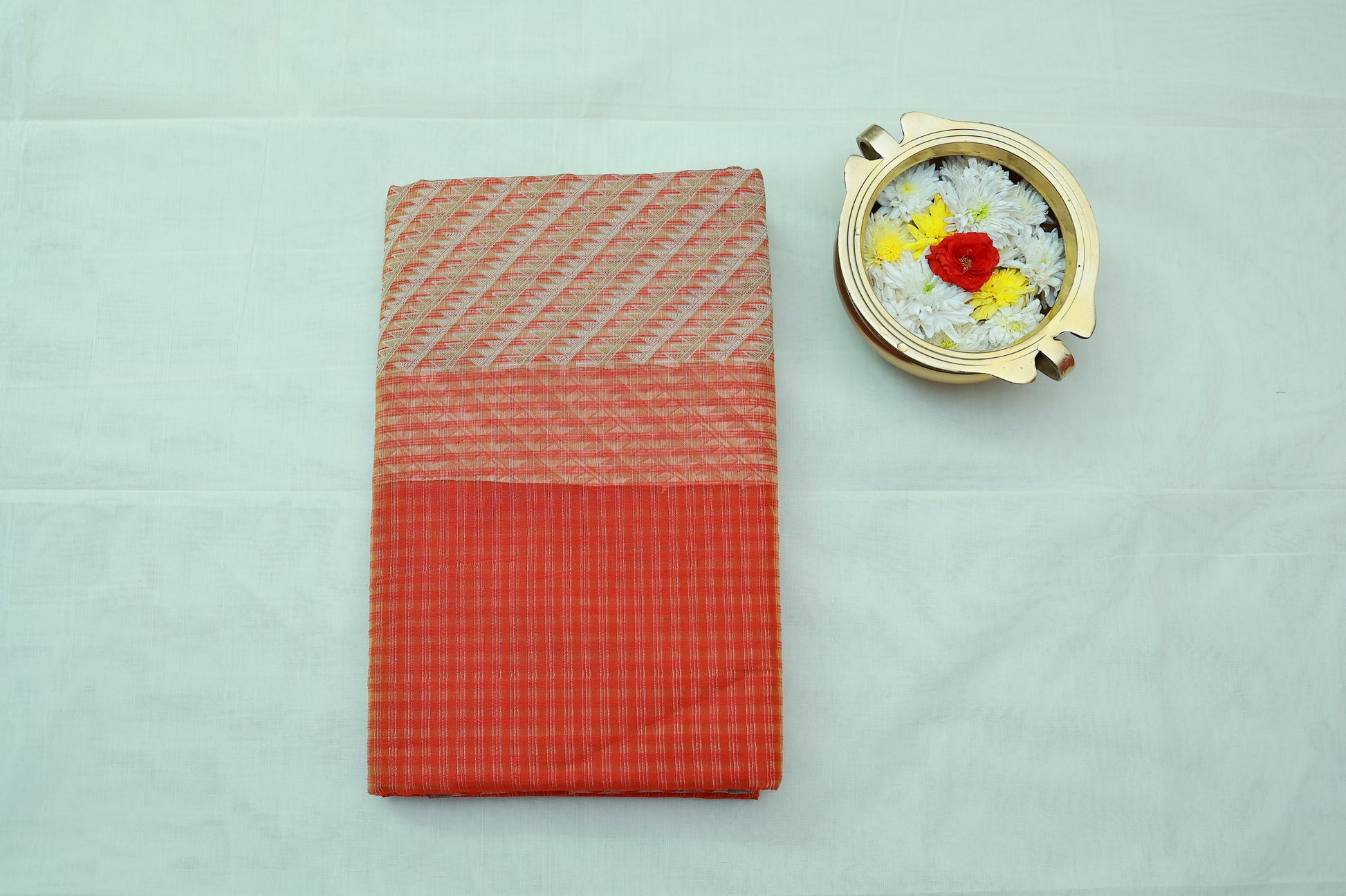 The saree features a beige base interwoven with diagonal leaf or arrow like motifs in rust and coral red shades, creating a consistent and rhythmic pattern across the body. The pallu is contrasted in deep rust red, enhanced with fine vertical stripes, lending it a modern finish while maintaining a handloom charm. The edges are subtly defined with a muted greyish-brown selvedge, adding structure without overpowering the design.